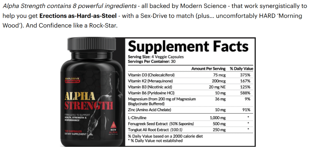 Alpha Strength is a supplement created to help improve energy levels, physical performance, and support natural hormone production. It uses a blend of natural ingredients to promote overall wellness and is targeted toward men seeking to optimize their lifestyle.